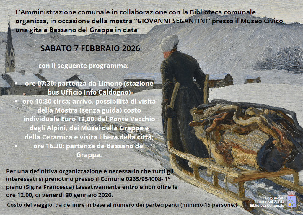 L’Amministrazione Comunale, in collaborazione con la Biblioteca Comunale, organizza, in occasione della mostra “GIOVANNI SEGANTINI” presso il Museo Civico, una gita a Bassano del Grappa in data