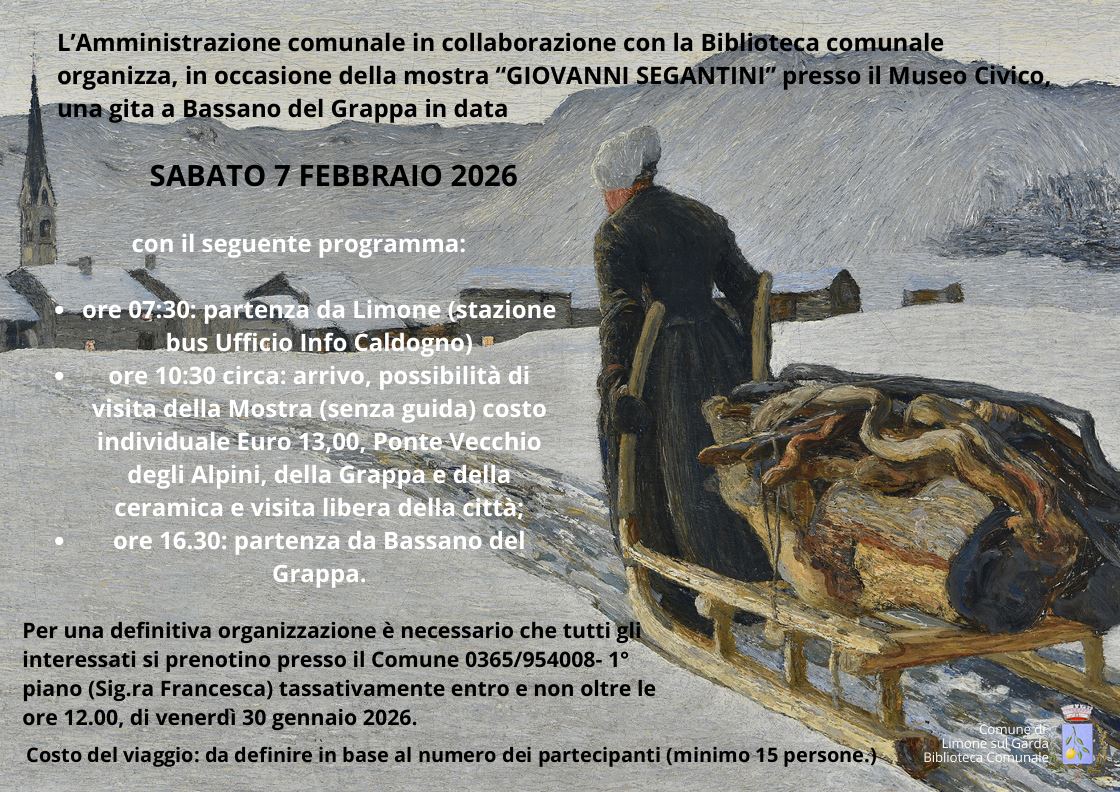 L’Amministrazione Comunale, in collaborazione con la Biblioteca Comunale, organizza, in occasione della mostra “GIOVANNI SEGANTINI” presso il Museo Civico, una gita a Bassano del Grappa in data